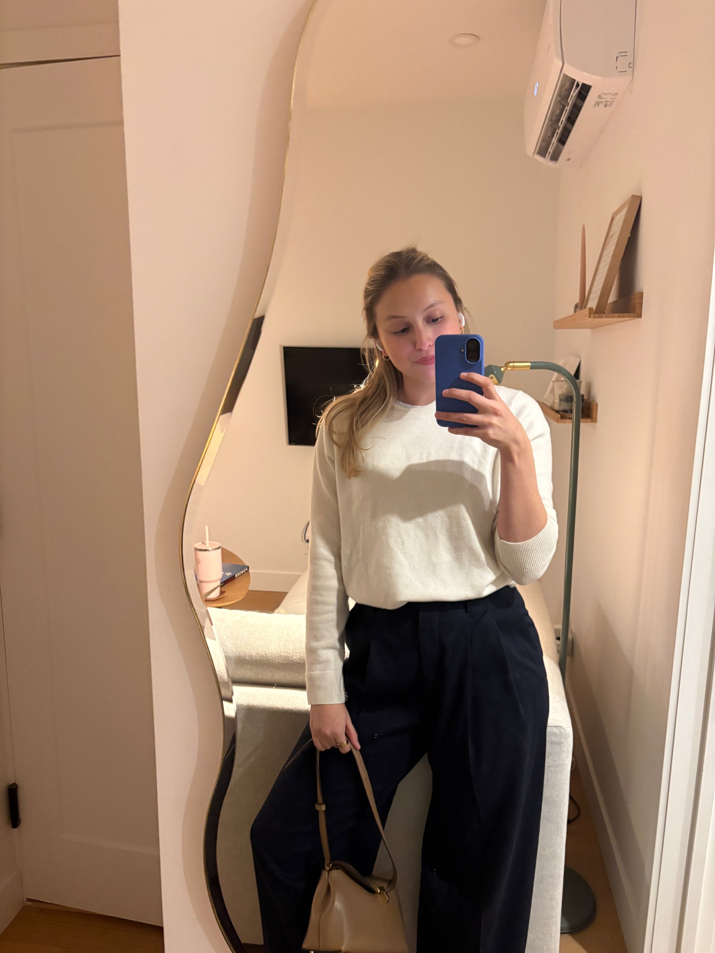 I wore COS trousers with a Uniqlo cashmere sweater for an easy, comfortable outfit, and finished the look with my Totême bag. I love this mix of cream, navy, and camel, so chic!