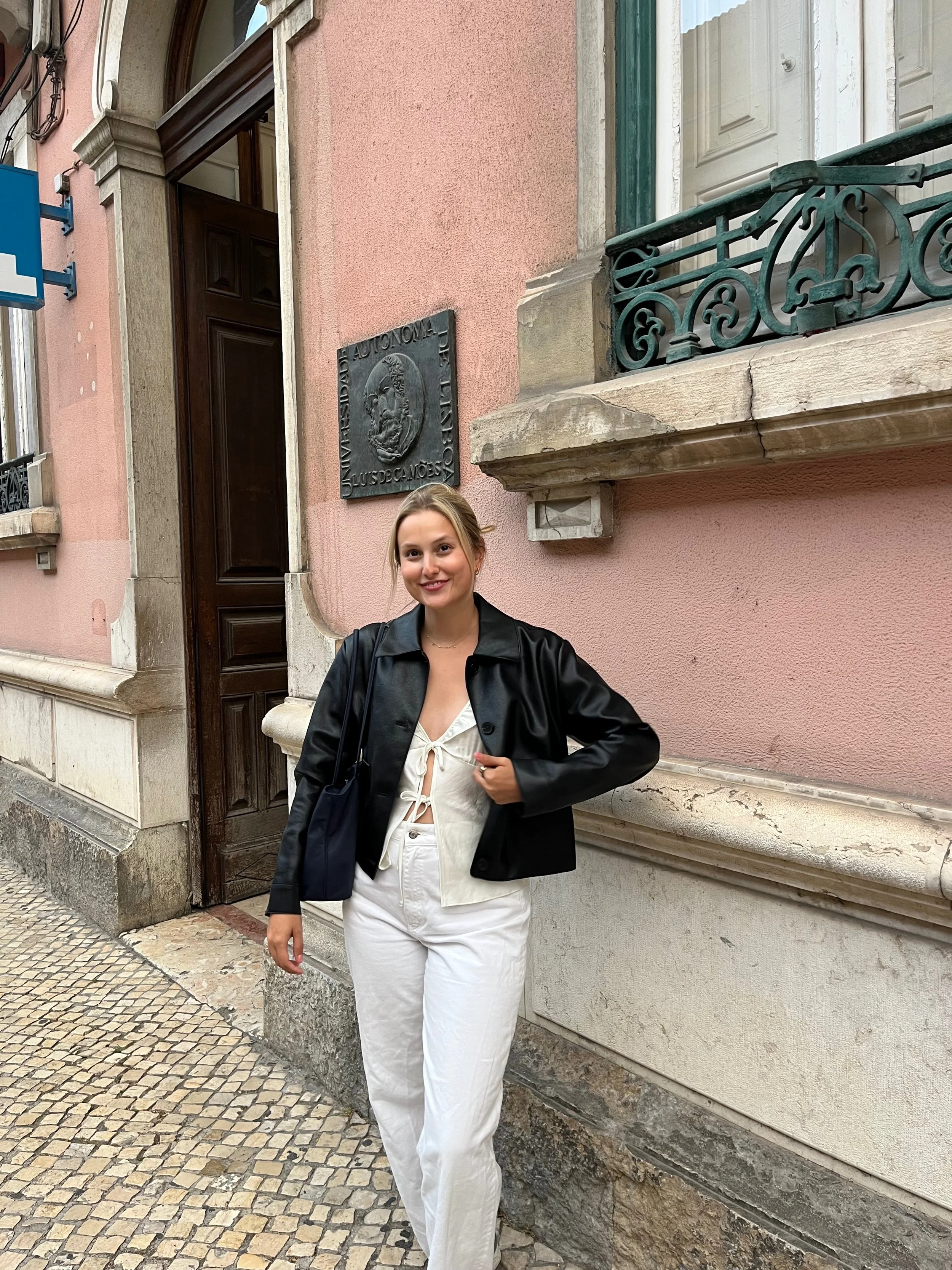 The next day I spent in Lisbon was cooler, so I wore one of my favourite secondhand finds: a broderie anglaise dress with long puffed sleeves from Rodebjer. Later, when the evening chill set in, I changed into something cozier for dinner: my Mango leather jacket, Filippa K jeans, and an Aritzia blouse.