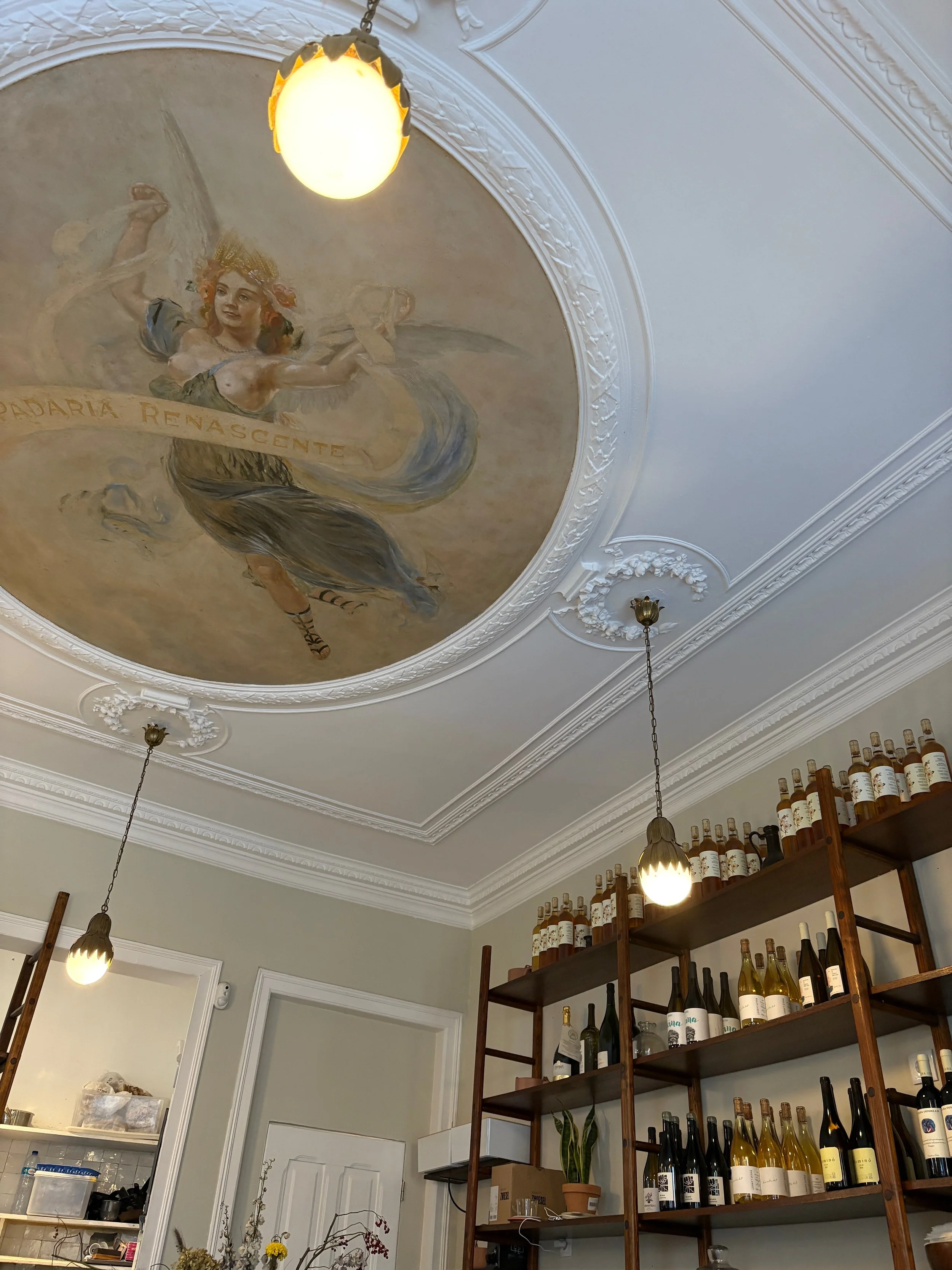 This was the wine bar we stopped at before dinner with Martine. A cozy little spot on the corner of the street, perfect for an apéro. I loved everything about it: the fresco on the ceiling, the dark wooden shelves lined with wine bottles, and the flowers scattered everywhere. I had a fresh glass of orange wine that tasted incredible. While we were there, I also spotted the most stylish woman wearing a Frankie shop blazer and suede loafers, and it gave me so much fashion inspiration!