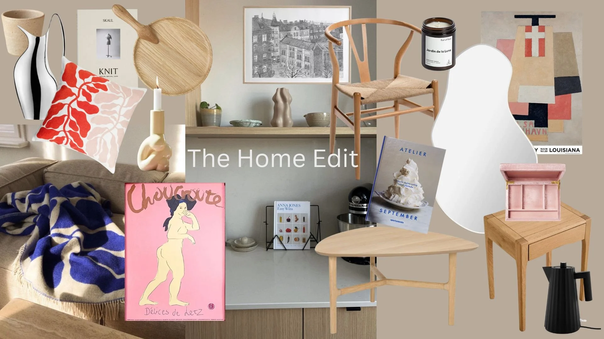Favourite pieces in my home (left to right) : Cup - Pophams Home / Pitcher - Georg Jensen / Book - Skall Studio / Cushion - Arket / Blanket - Arket / Platter - / Candle holder - Hay / Choucroute print / Gothenburg print - Fine Little Day / Wishbone chairs / Candle - Earl of East / Book - Atelier September / Coffee Table - Article / Mirror - Ferm Living / Print: Louisiana Museum / Jewelry case - Sophie Bille Brahe / Bedside table - Zara Home / Kettle - Alessi