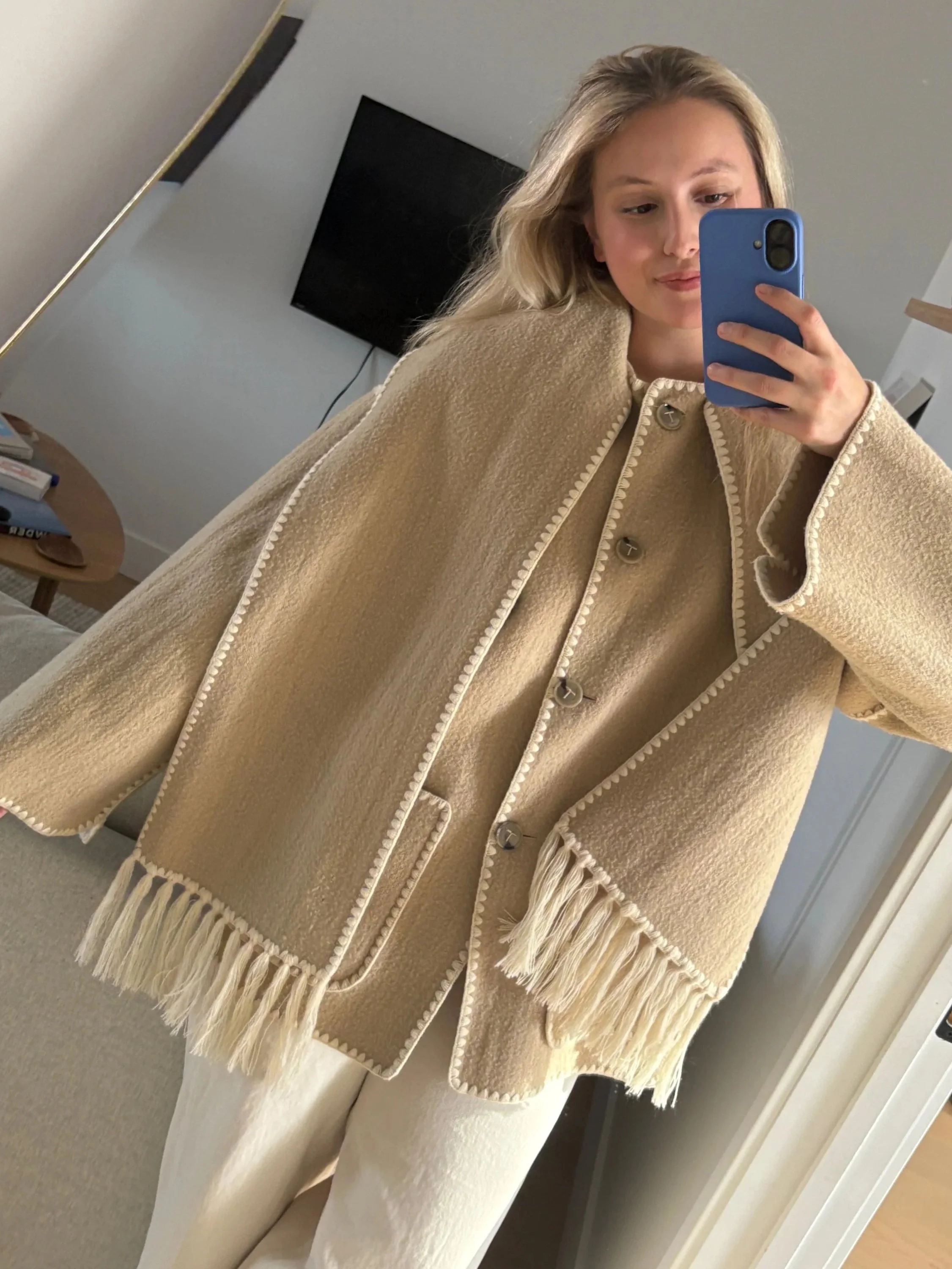 It’s been on my wishlist for years, and I finally found it last fall on Vestiaire Collective for a fraction of the retail price. I love the cream-and-beige colour combination, and of course, the integrated scarf. When I left the house, I realized I was dressed in the exact same colour palette as my home, which felt like a fun little nod to this week’s blog post.