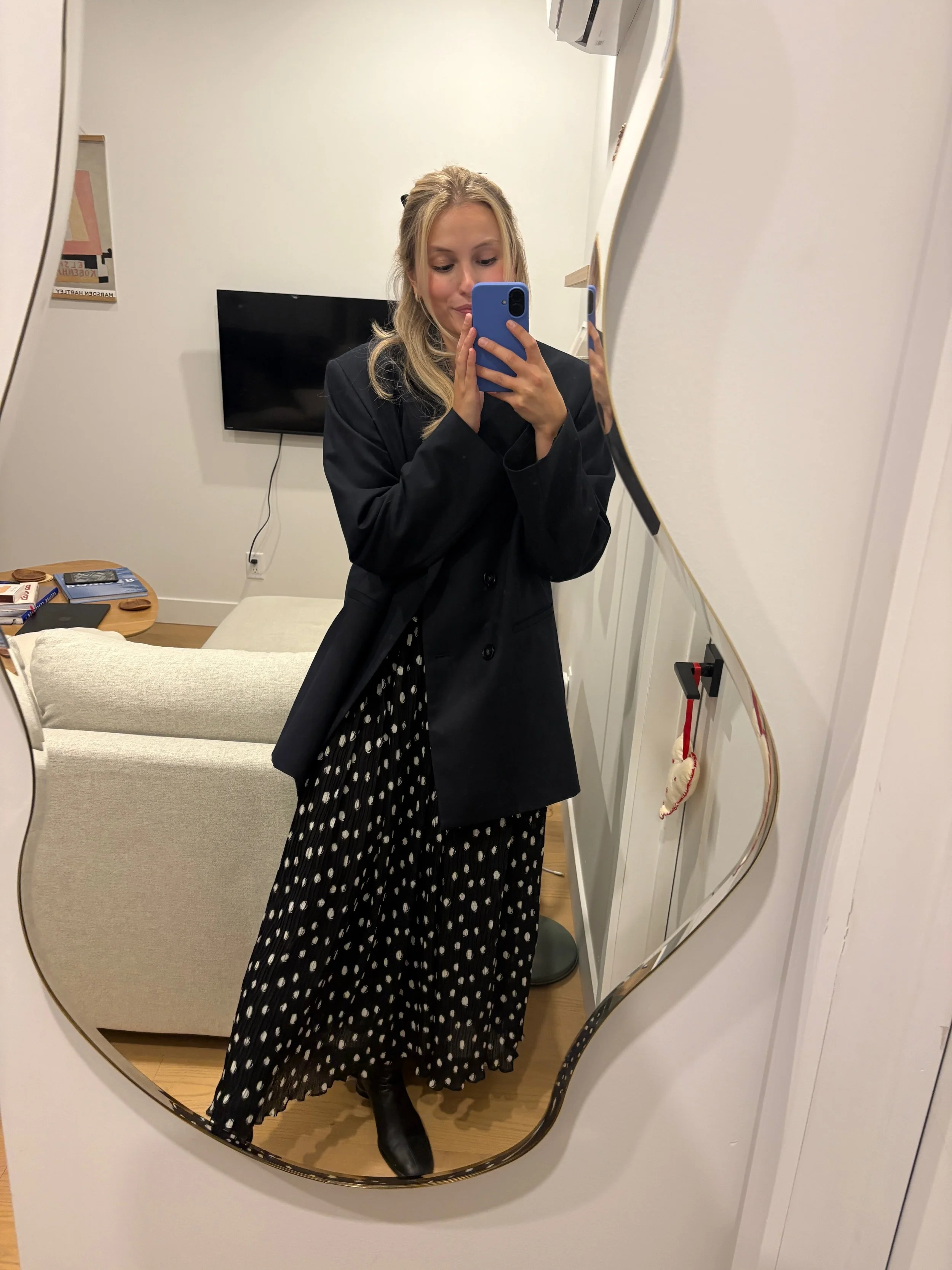 You might recognize this Baum und Pferdgarten polka-dot dress. It’s one of my go-to pieces for special occasions. This time, I styled it with an old pair of black sock boots from L’Intervalle and a secondhand Rodebjer blazer. I love the contrast between the sleek boots, the structured jacket and the flowyness of the dress. I finished the look with a half-up hairstyle and a ribbon tied into a bow.