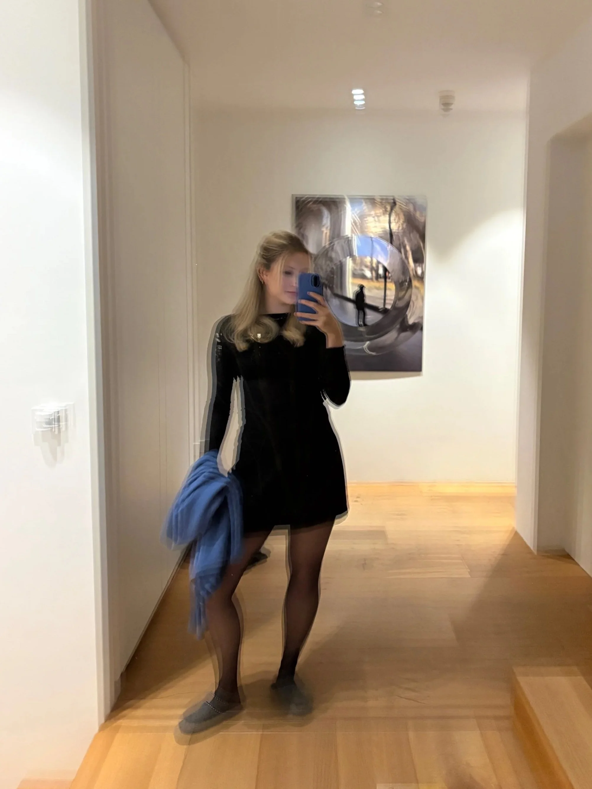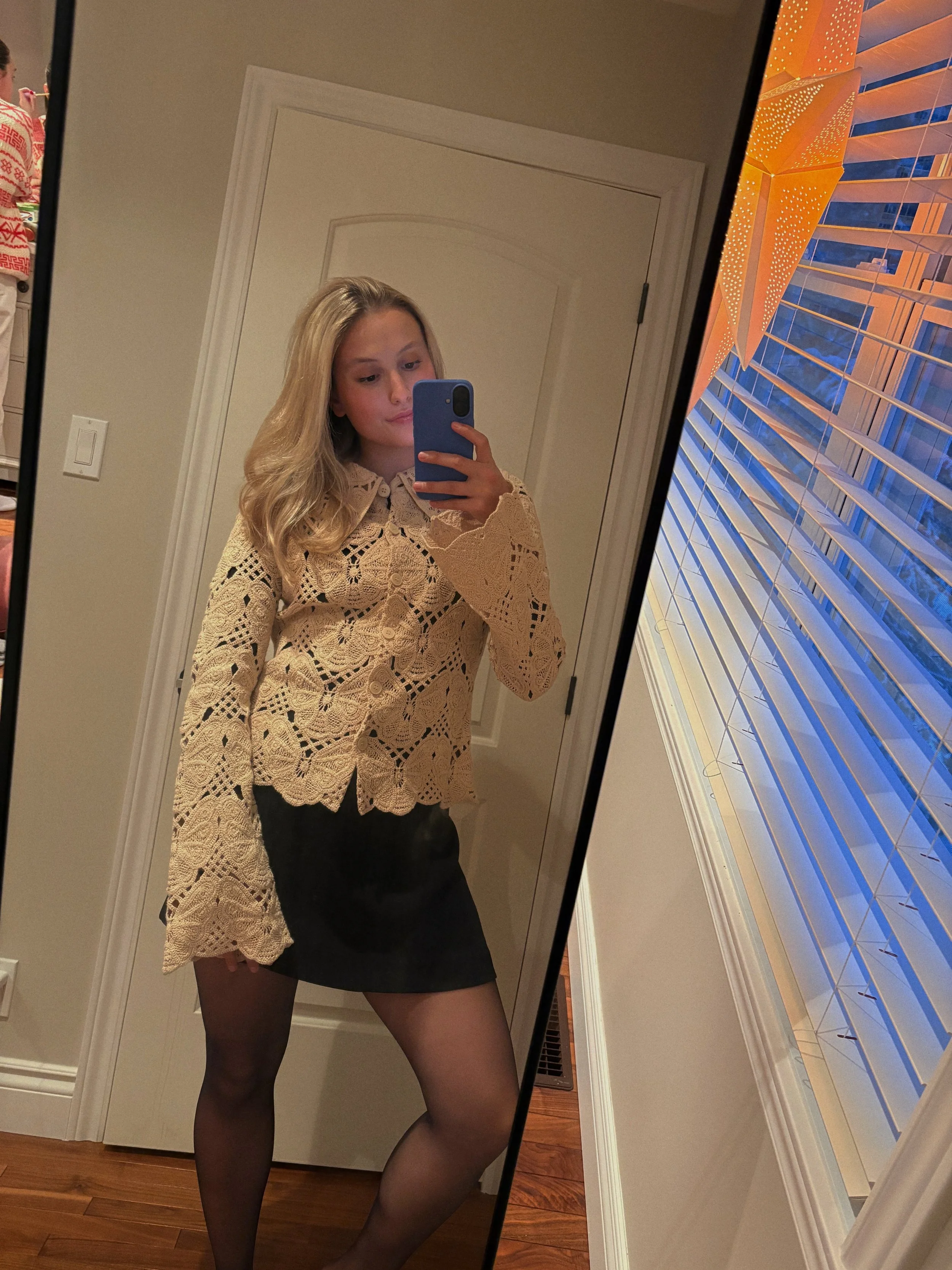 On Christmas Eve, I styled it with my By Malene Birger cardigan, featuring an exaggerated collar, wide sleeves, and crocheted butterfly details. For New Year’s Eve, I kept things comfortable by layering my Totême blue cashmere sweater on top and finishing the look with warm slippers.