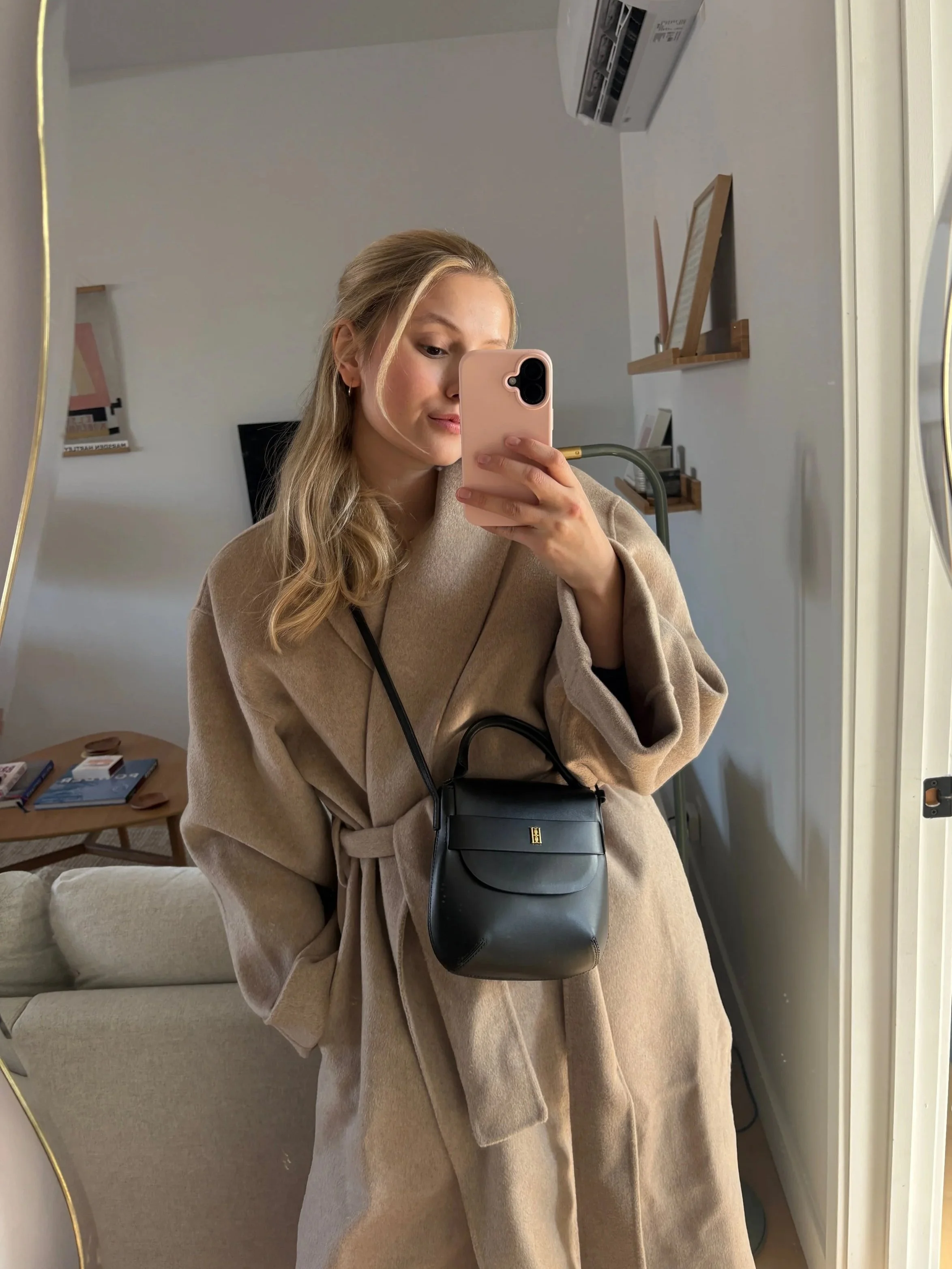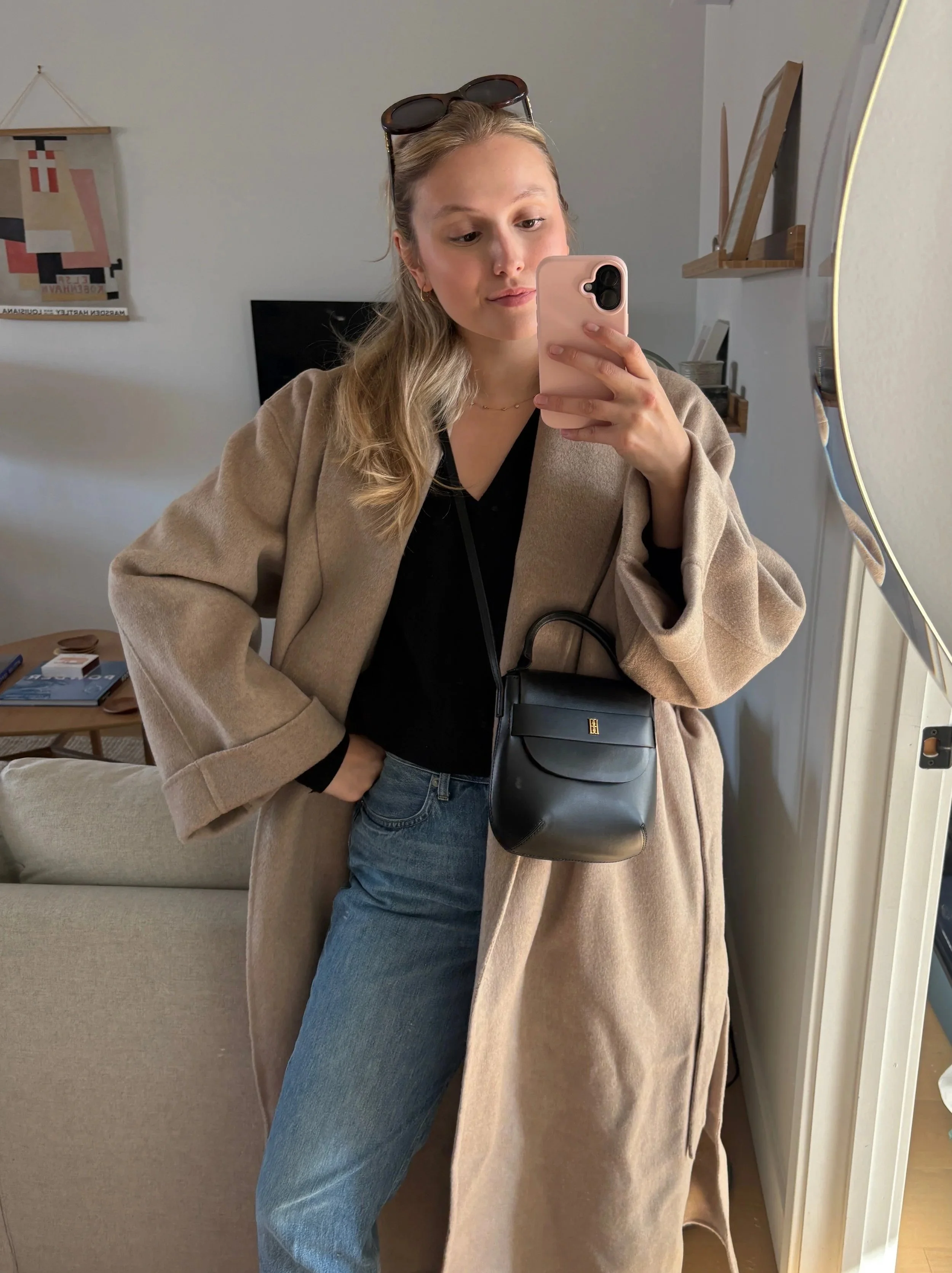 I wore my oversized By Malene Birger Trullem coat and paired it with a bag from the same brand. I love the contrast between the slouchy, almost enveloping shape of the coat and the clean structure of the bag, and the contrast between the black and the beige. It’s all about balance.