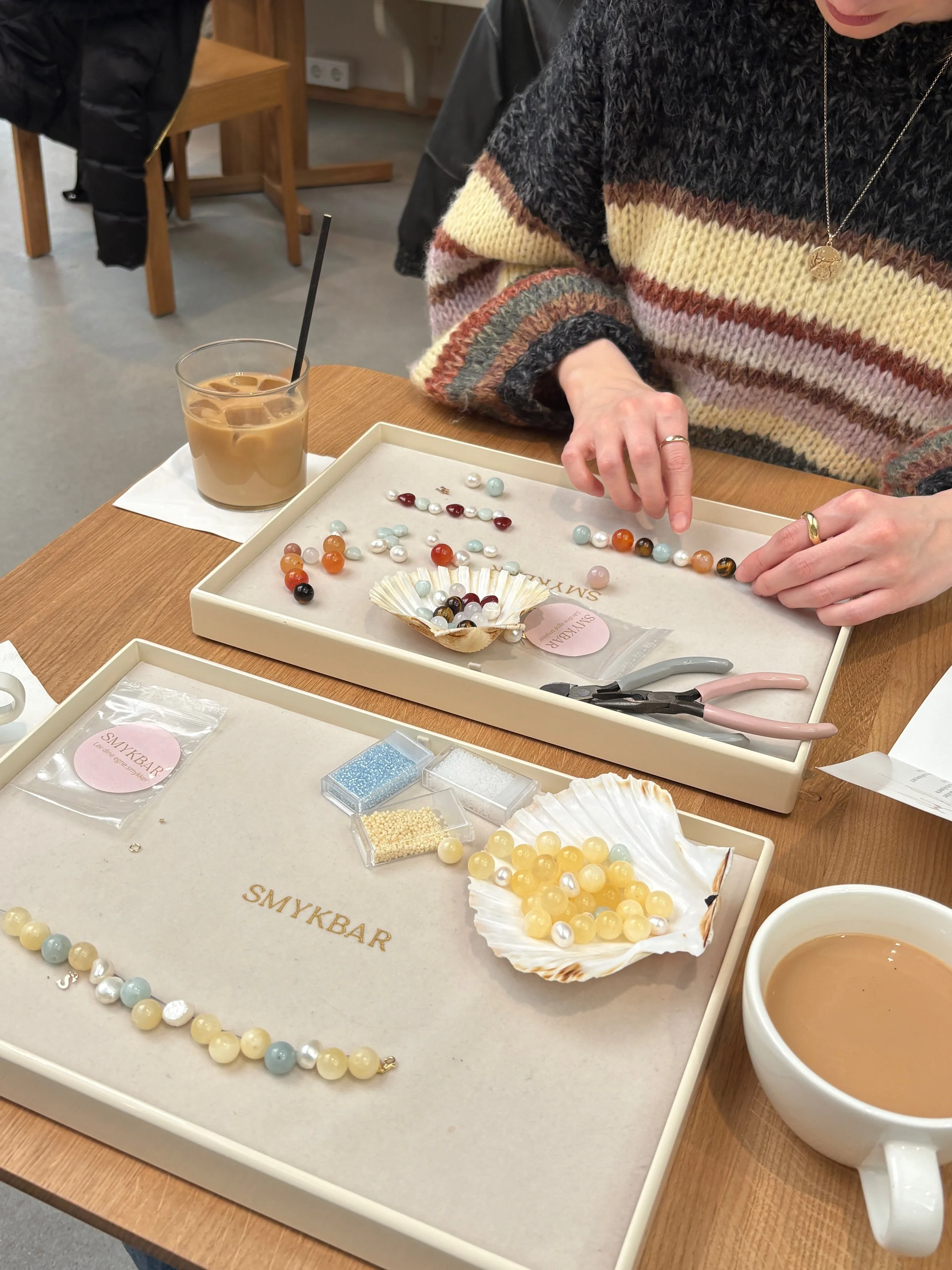 To celebrate Martine’s birthday, I wanted to plan a fun activity for us to do together. I came across this Danish shop called Smykbar, located in Ottensen, that's essentially a jewelry café where you can create your own pieces with beautiful beads while sipping on a latte, matcha, or tea.