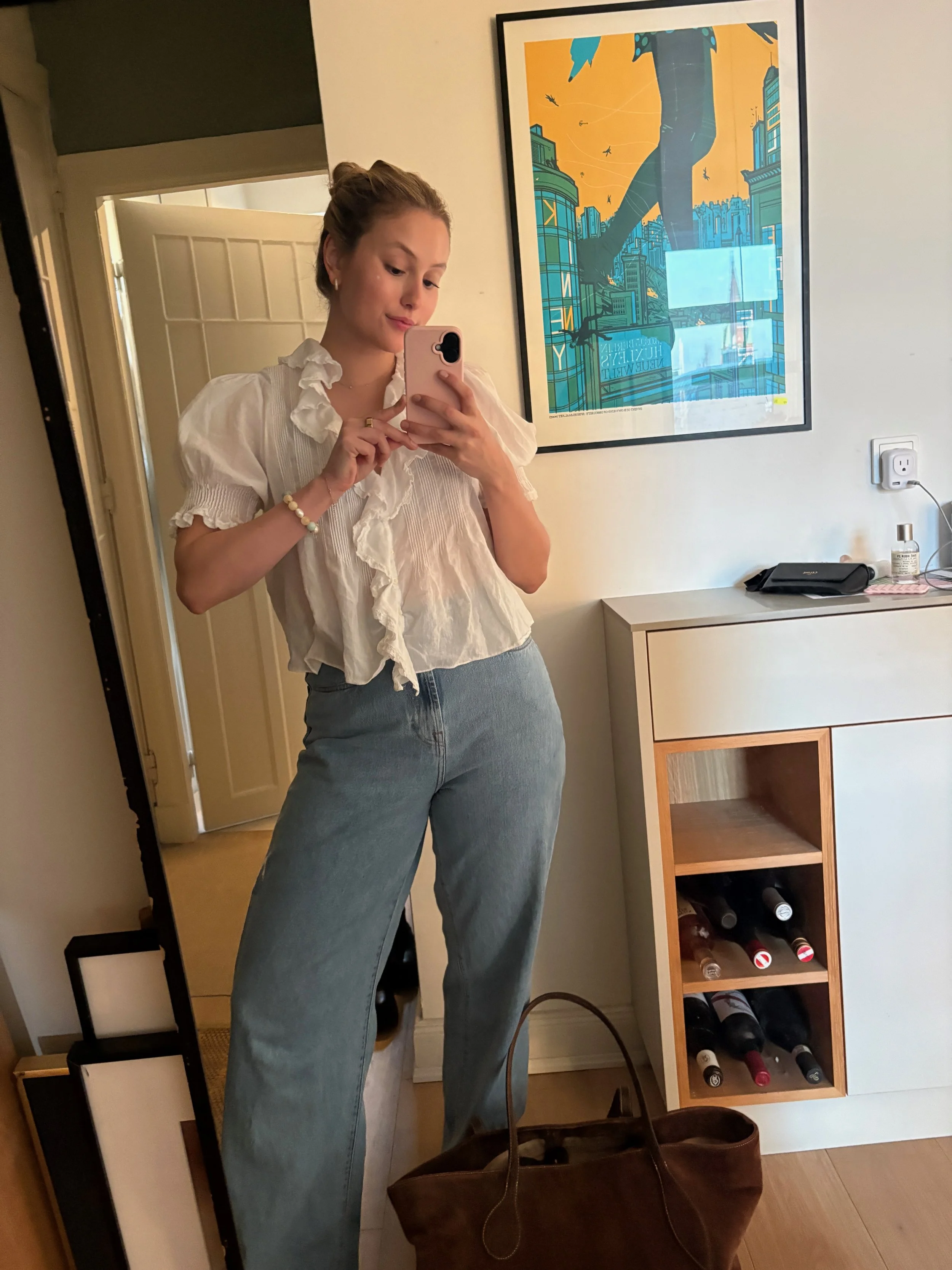The last outfit is what I wore on a typical school day, and again, something in which I really felt like myself. The Doên top is a staple in my wardrobe, I even own it in three colours, but I especially love the romantic feel of the white one. I paired it with my Liffner tote bag and oversized Rohé jeans.