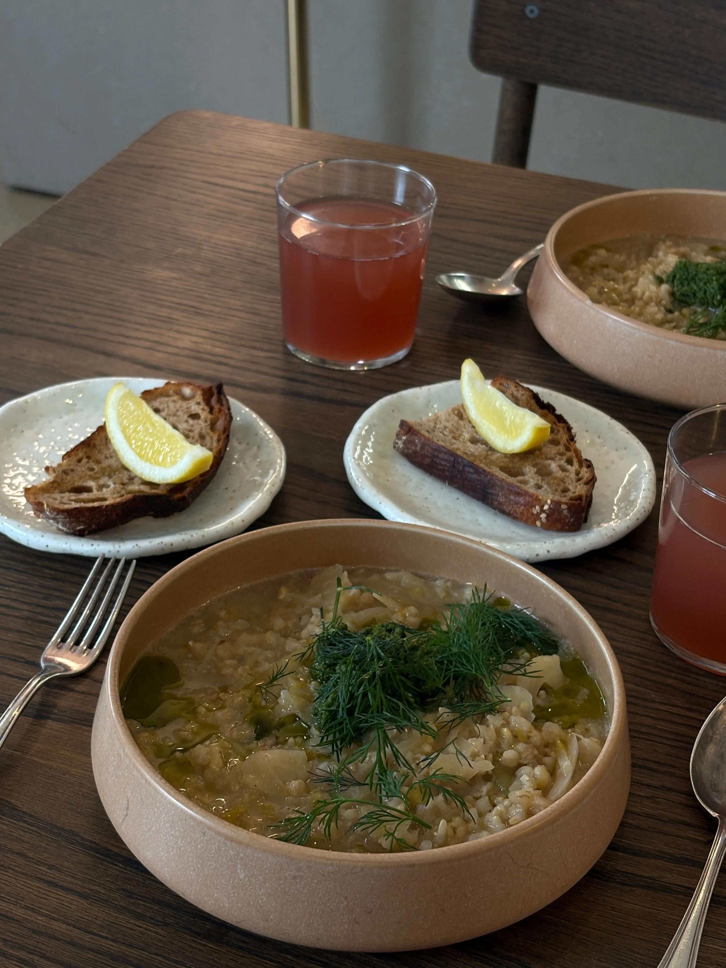Lemony Miso Rice Stew with dill, pumpkin seed pesto and sourdough bread at ÆNDRÈ