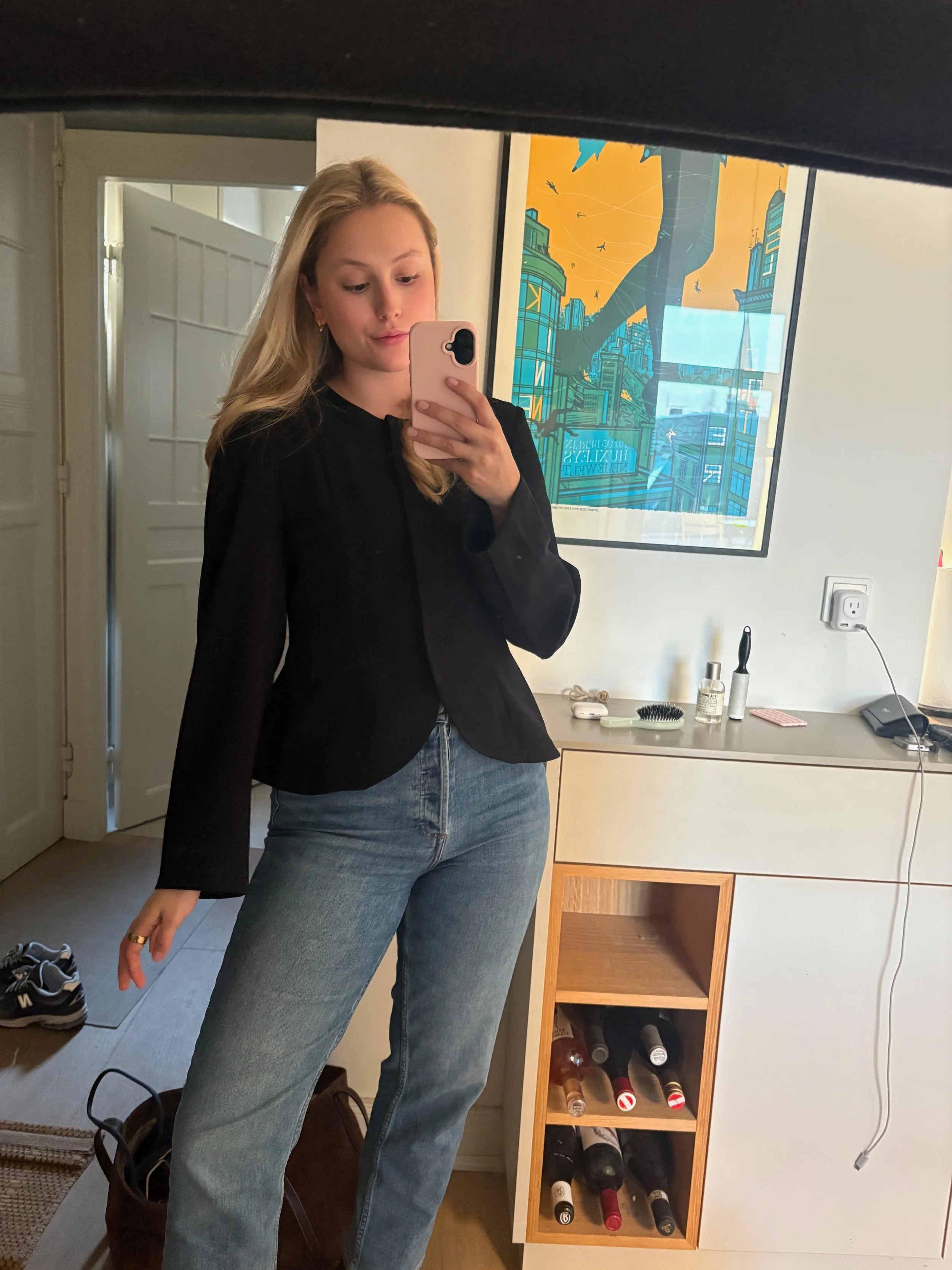 Blazer/Blouse - StyleIn / Jeans - Aritzia / Bag - Little Liffner
