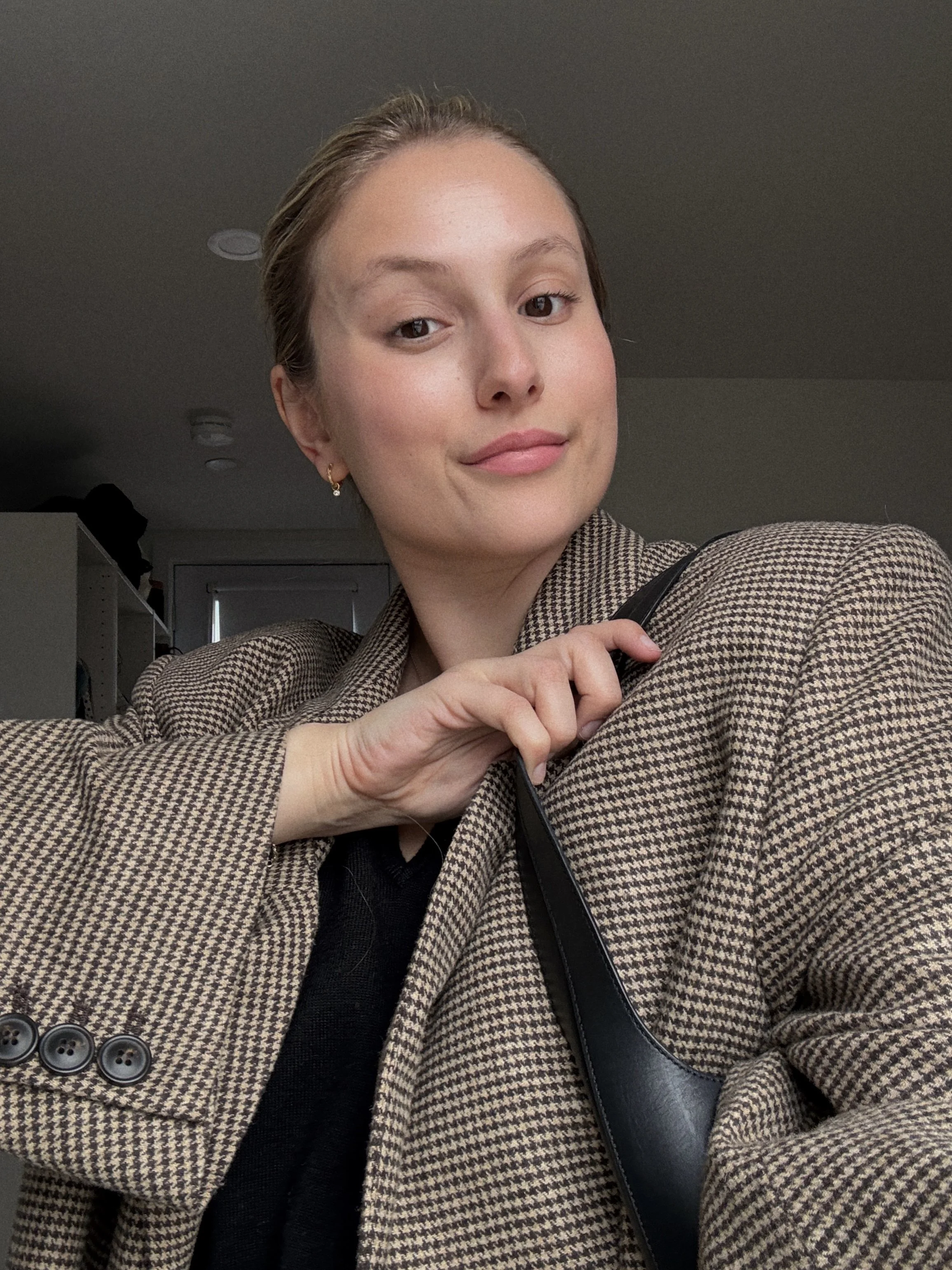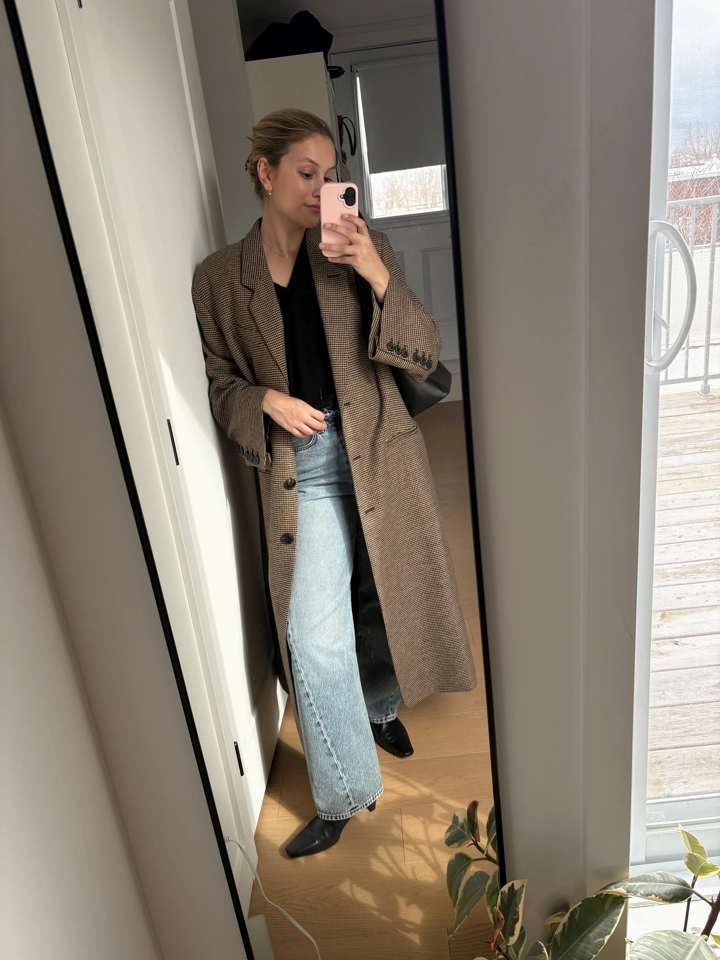 The centrepiece is a pied-de-poule coat I discovered in Stockholm, which instantly elevates the look. I paired it with my secondhand Totême boots and their twisted jeans, which are a particularly flattering cut that really elongates the leg.