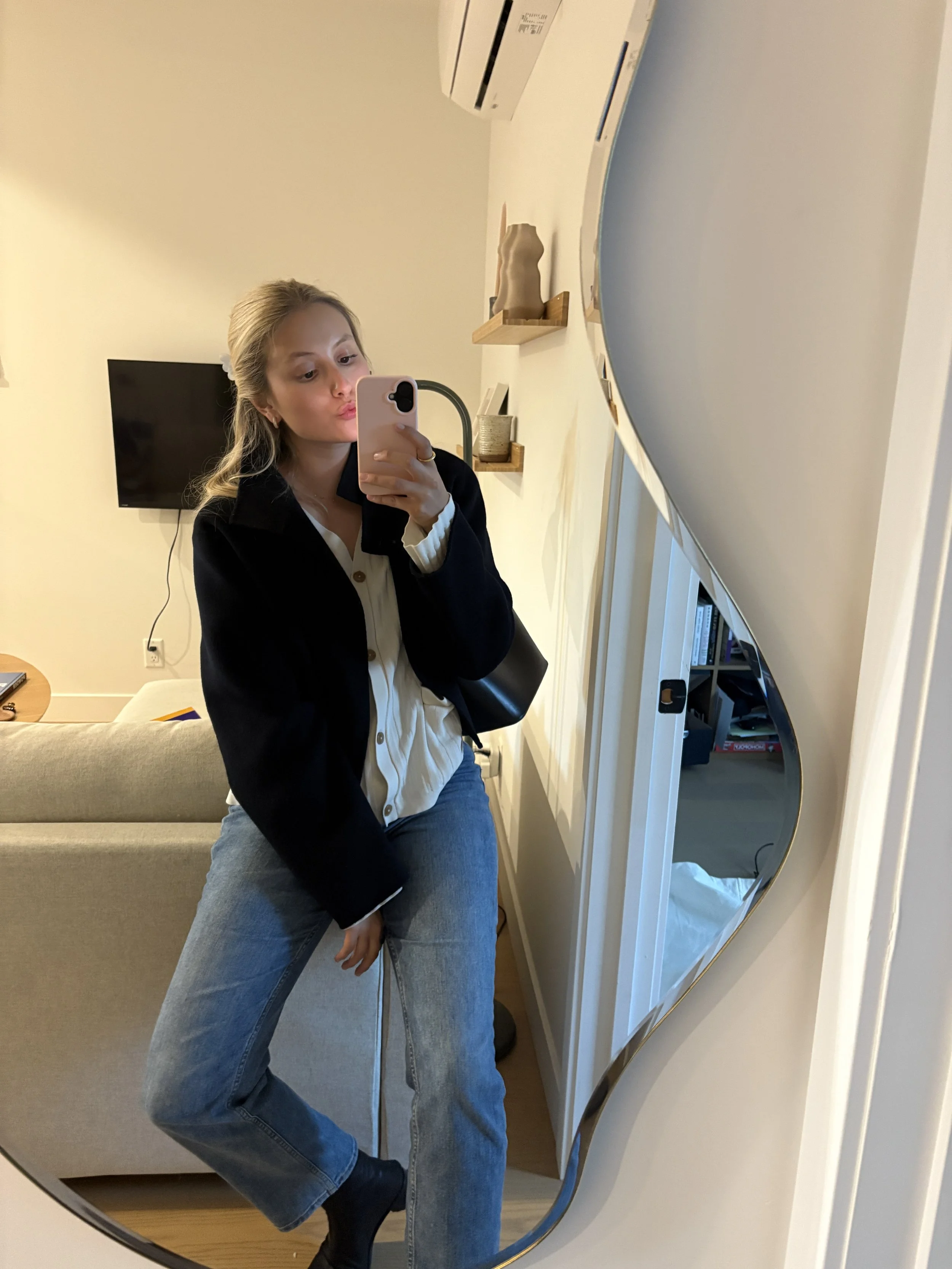 I leaned into the theme of Scandinavian secondhand dressing this week with a more casual look: classic jeans and black boots (my fall staple), paired with a ribbed Totême cardigan and a double-faced cashmere & wool jacket from Filippa K. Both pieces are pre-owned finds I’ve cherished in my wardrobe for years. To finish it off, I added another Nordic touch: my Aesther Ekme half-moon shoulder bag.