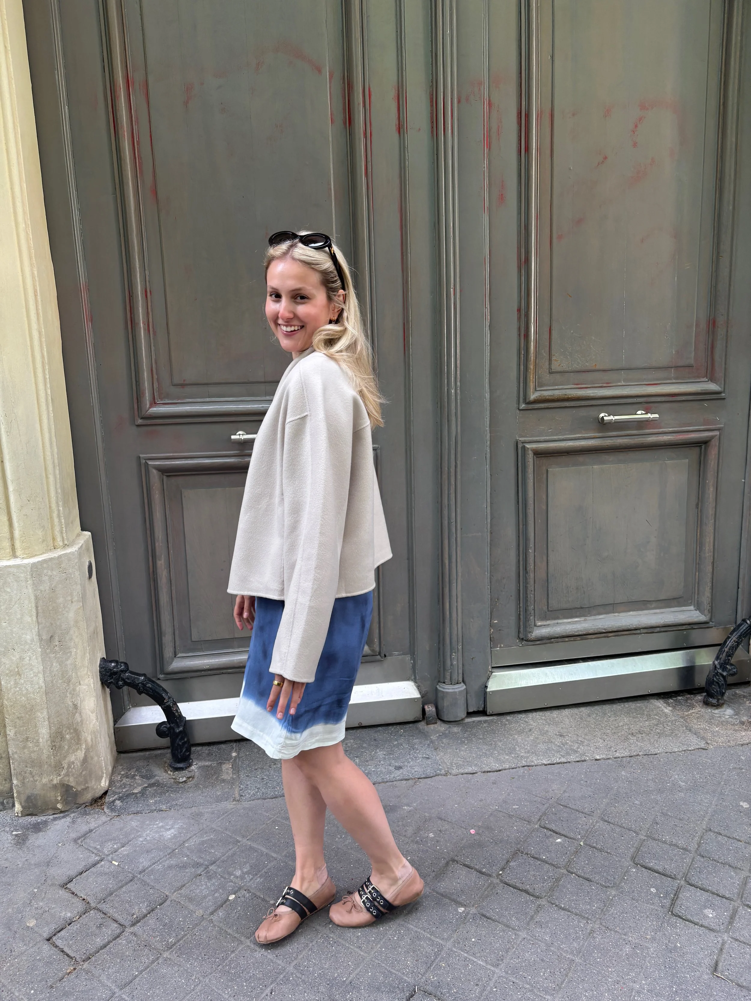 For a full day of wandering the city, I wore a tie-dye-style dress from Rodebjer that I found secondhand in Stockholm a few years ago, paired with my trusted Miu Miu ballet flats. I layered it with a Dagmar wool jacket I picked up on my very first day in Paris (at Le Bon Marché, which I’ll get to later)