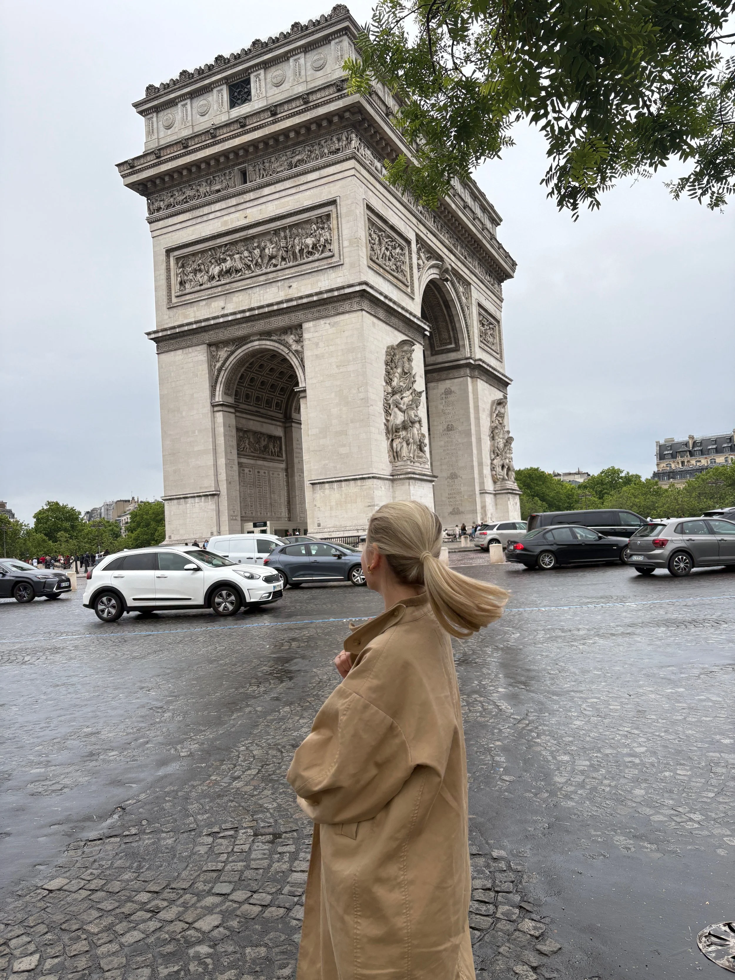 Wearing my AF Agger trench coat at the Arc de Triomphe